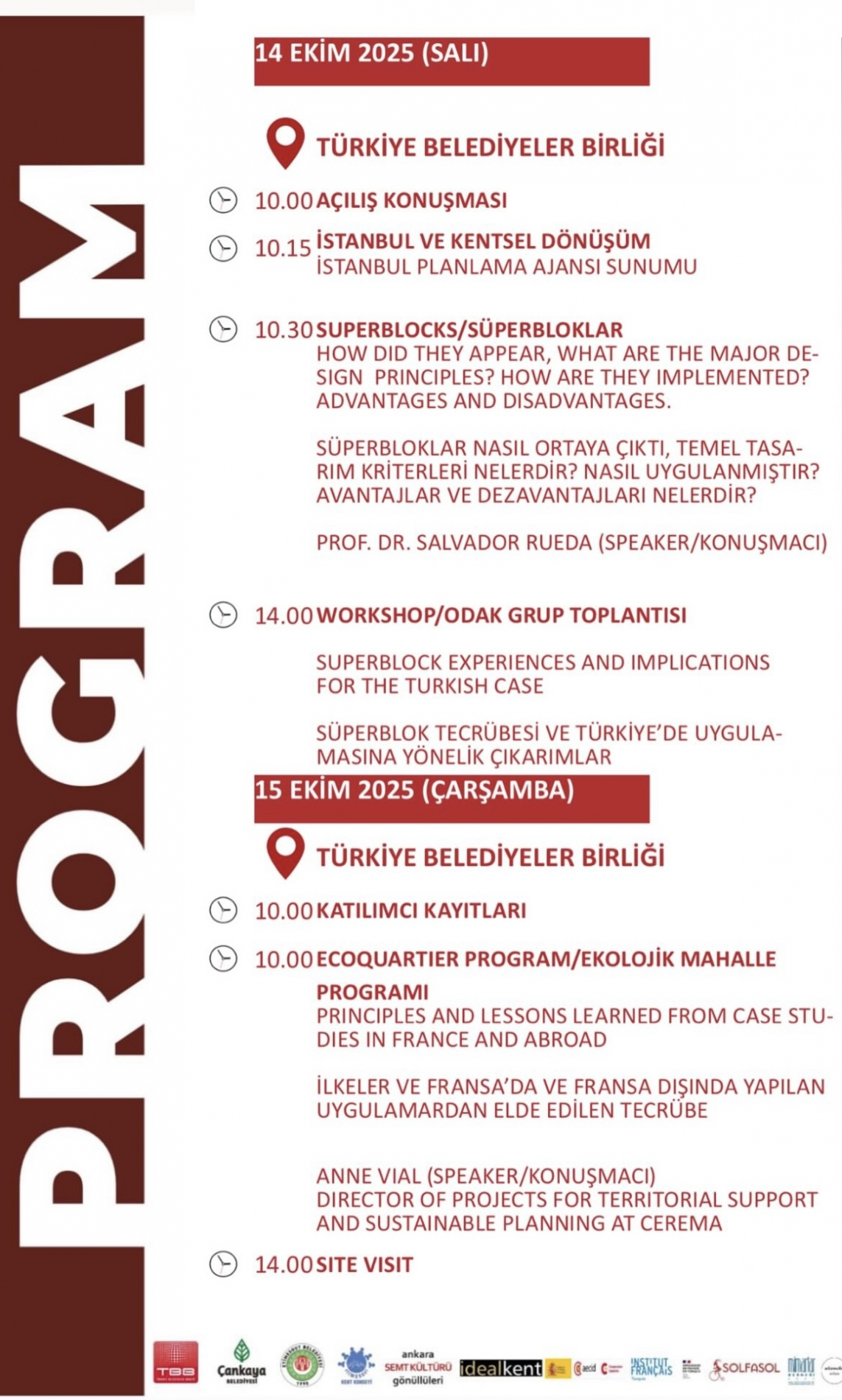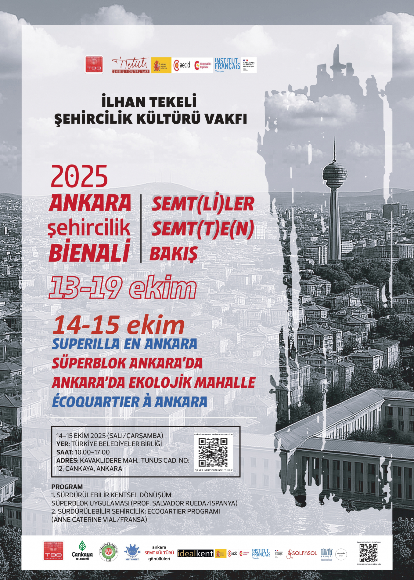 İTŞKV Ankara Şehircilik Bienali, 14 ve 15 Ekim 2025 tarihlerinde, 10.00 - 17.00 saatleri arasında Türkiye Belediyeler Birliği'nde gerçekleştirilecektir. "Süperblok Ankara" ve "Ankara'da Ekolojik Mahalle" temalarıyla düzenlenecek program, Prof. Dr. Salvador Rueda'yı konuk edecektir.