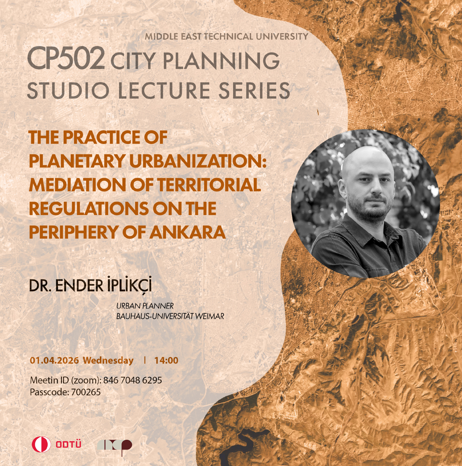 As part of the City Planning Master's Studio Seminar Series, Dr. Ender İplikçi will deliver a presentation titled "The Practice of Planetary Urbanization: Mediation of Territorial Regulations on the Periphery of Ankara" on Wednesday, April 1, 2026. The seminar will be held online. All students and interested participants are cordially invited.