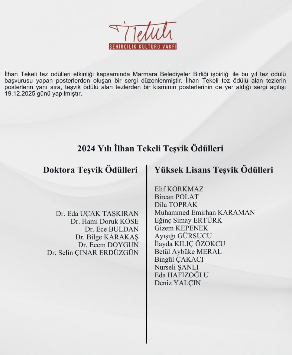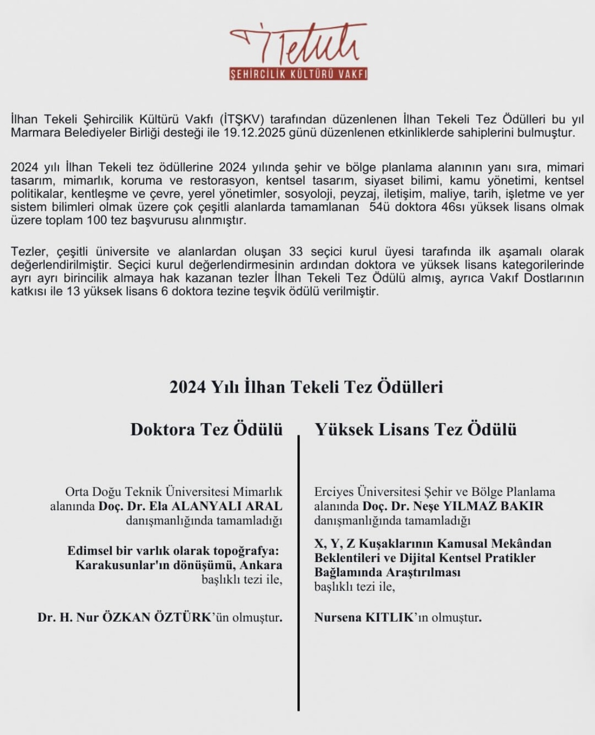 İlhan Tekeli Thesis Awards, organized by the İlhan Tekeli Urbanism Culture Foundation (İlhan Tekeli Şehircilik Kültürü Vakfı - İTŞKV), were presented to their recipients at the events held on 19 December 2025, this year with the support of the Union of Marmara Municipalities.