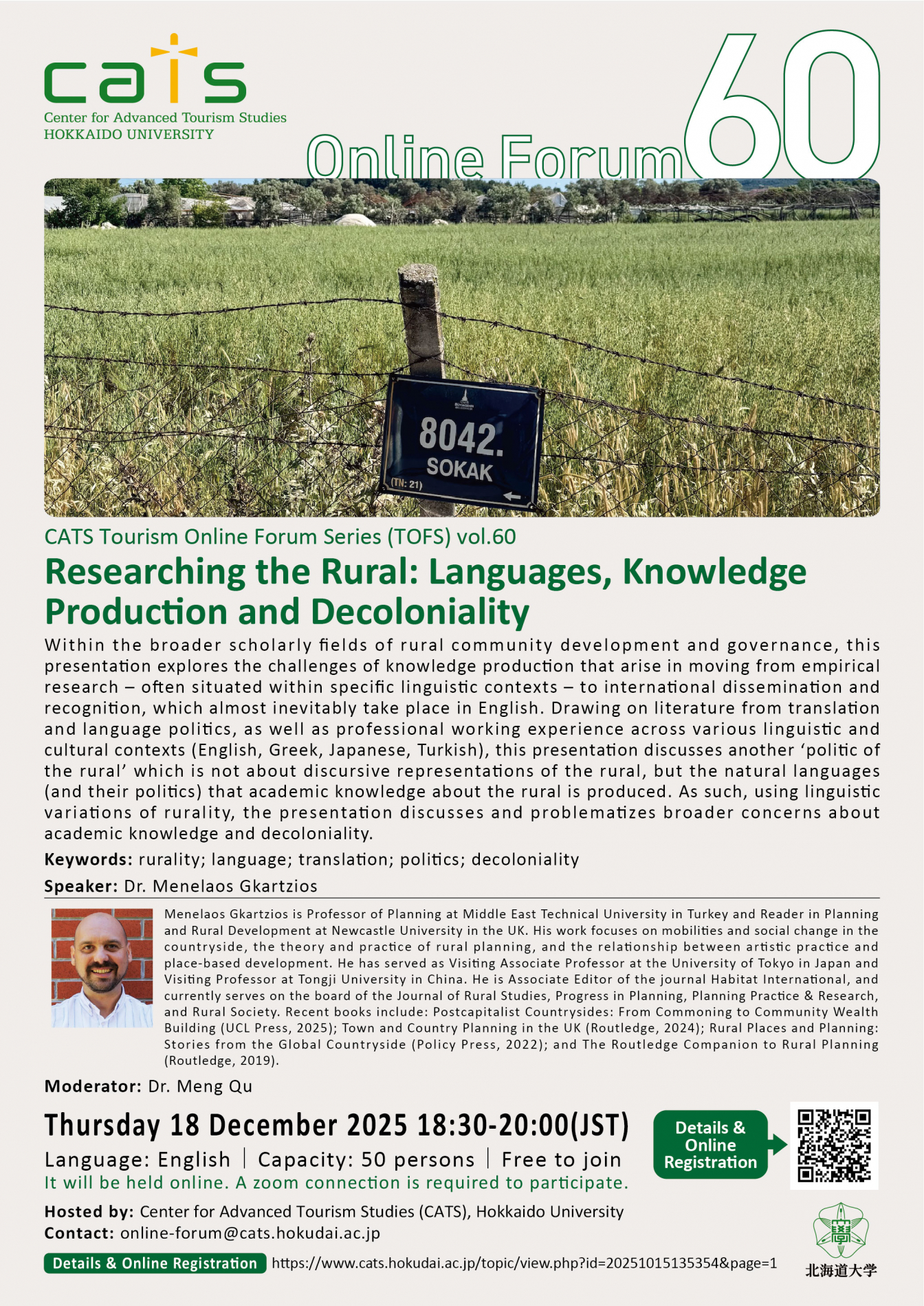 Within the scope of the CATS Tourism Online Forum Series (TOFS) vol.60, Prof. Dr. Menelaos GKARTZIOS will have an online presentation titled "Researching the Rural: Languages, Knowledge Production and Decoloniality". All parties are cordially invited.