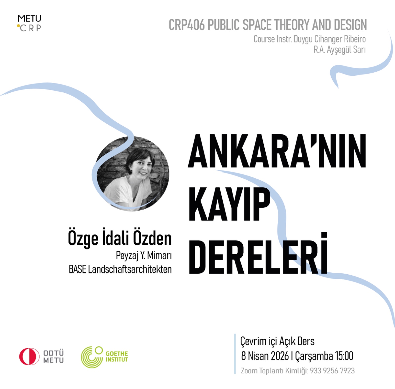 CRP406 Public Space Theory and Design dersinin temel kurgusunu oluşturan "Ankara'nın Suyuna Bak" adlı proje dahilinde yer alacak "Ankara'nın Kayıp Dereleri" başlıklı açık ders, Özge İdali Özden tarafından 8 Nisan 2026 tarihinde saat 15:00'te gerçekleştirilecektir. Ders, çevrim içi ve Türkçe formattadır. Tüm ilgililer davetlidir.