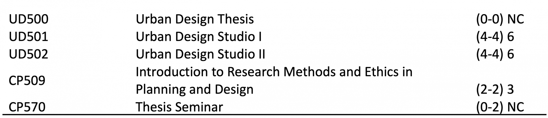 Müfredat genellikle tasarım stüdyolarını destekleyici kuramsal ve yöntemsel derslerle birleştirir. Stüdyolar, öğrencilerin farklı ölçeklerde kentsel tasarım önerileri geliştirdiği temel öğrenme ortamını oluşturur. Bu süreçte alan analizi, morfolojik okuma, kamusal alan tasarım ilkeleri ve senaryo temelli yaklaşımlar kullanılır. Tamamlayıcı dersler ise öğrencilerin kentsel tasarım kuramı, kentsel form ve morfoloji, mekân oluşturma (place-making) ve kapsayıcı kamusal alan, iklime duyarlı ve doğa temelli tasarım, hareketlilik ve kamusal alan entegrasyonu ile ileri görselleştirme ve temsil teknikleri konularındaki yetkinliklerini derinleştirir. İlk iki yarıyılda stüdyo ve destekleyici derslerin tamamlanmasının ardından öğrencilerin bir danışman öğretim üyesi rehberliğinde yüksek lisans tezleri üzerinde çalışmaları beklenir.